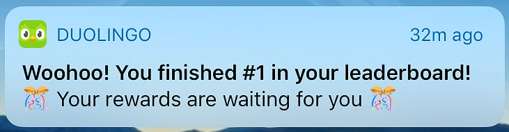 And best (or worst) of all, there’s a leaderboard. When you begin using that app, you’re placed in a Bronze group with 49 fellow Duolingers. If you do well, you move up to Silver. If you do well in Silver, you move to Gold or back down to Bronze if you do exceptionally poorly. In my first week, I came in first place: