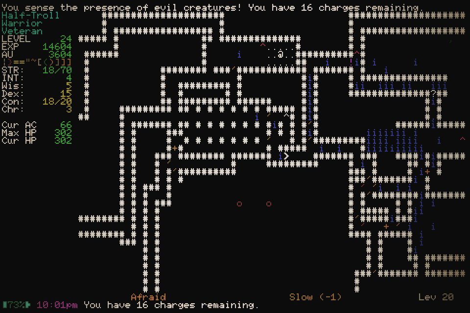 Which is where Angband comes in. It vastly improved the scope and depth of its predecessor and, more importantly, was now available on the PC. Even today, Angband one of the more popular Rogue descendants. Angband was (and is) my “Rogue Two.”